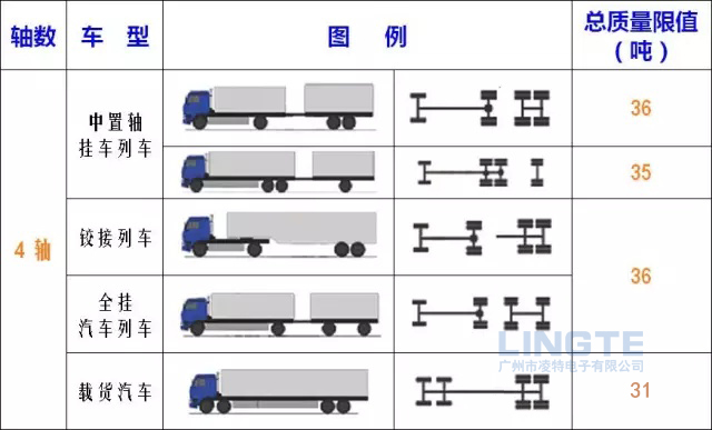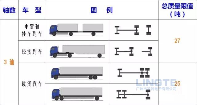 2、除驅(qū)動軸外,下文中的二軸組、三軸組以及半掛車和全掛車,每減少兩個(gè)輪胎,其總質(zhì)量限值減少3噸。