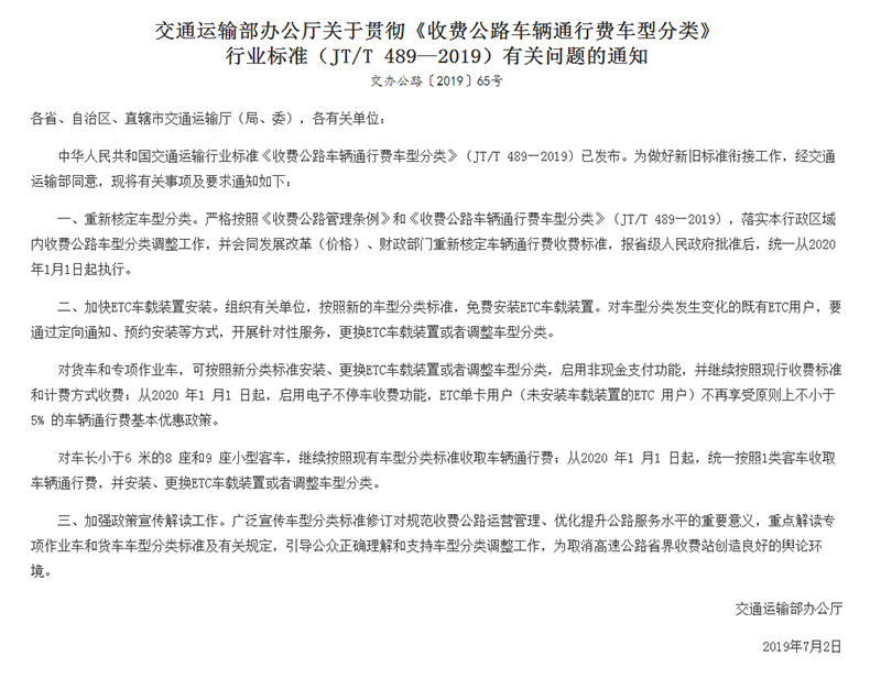 中華人民共和國交通運(yùn)輸行業(yè)標(biāo)準(zhǔn)《收費(fèi)公路車輛通行費(fèi)車型分類》(JT/T 489—2019)已發(fā)布,落實(shí)本行政區(qū)域內(nèi)收費(fèi)公路車型分類調(diào)整工作,并會同發(fā)展改革(價格)、財政部門重新核定車輛通行費(fèi)收費(fèi)標(biāo)準(zhǔn),報省級人民政府批準(zhǔn)后,統(tǒng)一從2020 年1月1日起執(zhí)行。