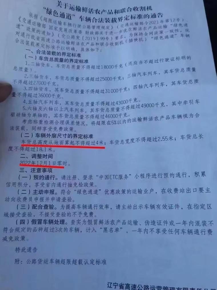 遼寧省高速公路運(yùn)營管理有限責(zé)任公司于2022年12月1日實(shí)施的《關(guān)于運(yùn)輸鮮活農(nóng)產(chǎn)品和聯(lián)合收割機(jī)“綠色通道”車輛合法裝載界定標(biāo)準(zhǔn)的通告》。受訪者供圖